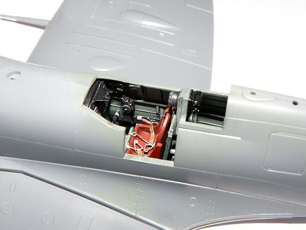 Zaszpachlowałem łączenie wiatrochronu z kadłubem płynną szpachlówką, niedługo surfacerowanie. Maski Montexu o dziwo pasują świetnie ( po smutnym doświadczeniu z Mustangiem ). Jaki kolor miał słynny łom w tym samolocie ?