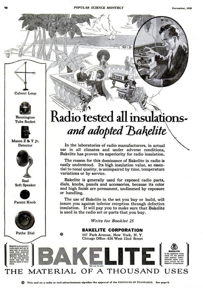 Druga rzecz - Bakelite. Nie pamiętam, kto miał w tamtych latach prawa do patentu - zdaje się, że Union Carbide and Carbon Corporation - ale z pewnością rozprowadzał je dość hojnie wśród podwykonawców. Wiele firm produkowało ten materiał, mimo wszystko zawsze z zachowaniem właściwej nazwy. Wachlarz zastosowań był jednak ograniczony, przede wszystkim do domowych produktów codziennego użytku. W sprzęcie wojskowym stosowano go raczej do wykonywania elementów wyposażenia, jak gałki różnych przełączników, fajki świec zapłonowych, obudowy sprzętu radiowego itp.