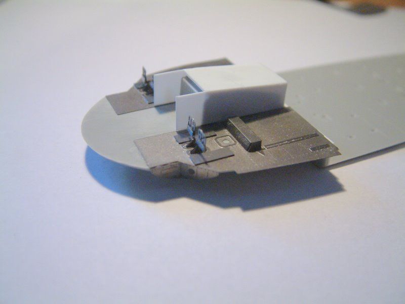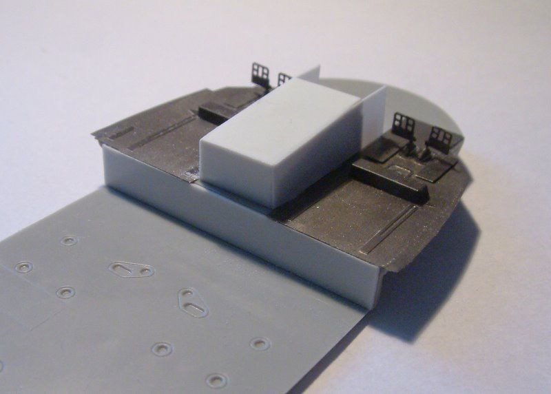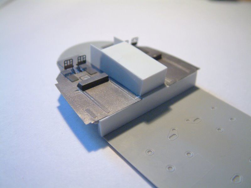 Zacząłem od kabiny pilotów. Blaszki Edka i własna "tfórczość". Półka z zegarami i przełącznikami była za niska. Blaszka Edka nie miała wytrawionych linii zagięcia i krawędzie zagięły się na obły kształt, więc ten element dorobiłem sam z płytki polistyrenu. Na to pójdzie kolorowa blaszka z namalowanymi zegarami.