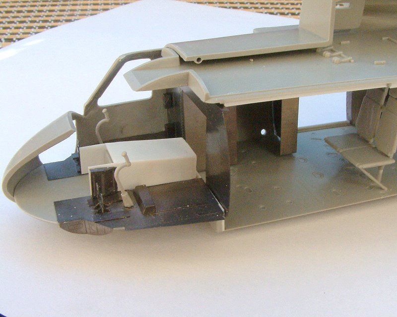 Następnie wkleiłem ściankę oddzielającą przedział pilotów od przedziału załogi, dokleiłem jakieś skrzynki w kabinie oraz drążki sterowe.