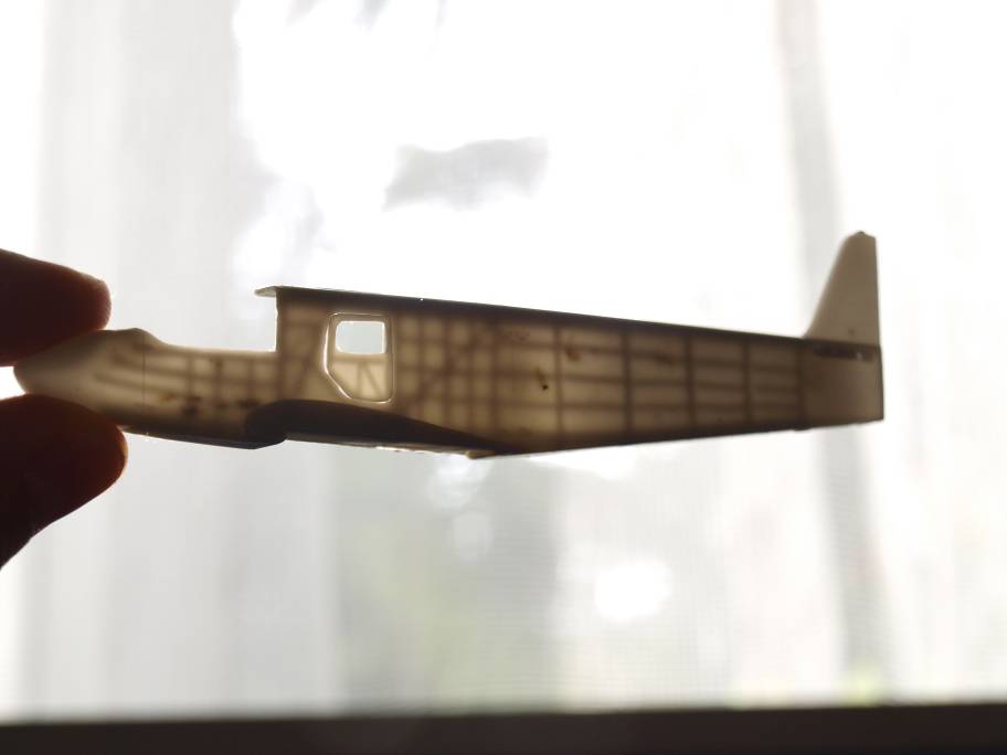 [Osłona kabiny z zestawu jest trochę za duża, a według planów kadłub powinien być i tak szerszy. Więc najpierw wkleiłem kawałki plastiku o grubości 0,75 i 1 mm. Następnie wyciąłem nowe drzwi, o właściwym kształcie, nie prostokątne, jakie zaproponował producent.
