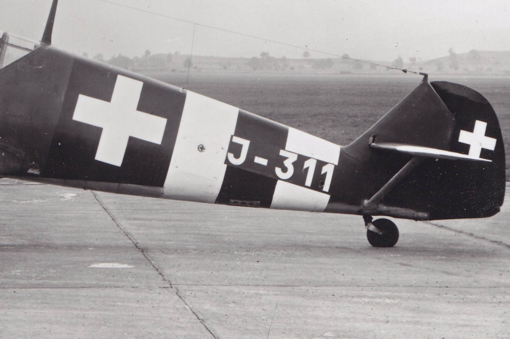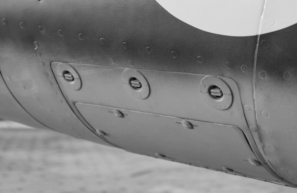 23. Wejście przewodu anteny do kadłuba było o jeden panel bliżej kabiny, niż w niemieckiej wersji - Szwajcarzy dostali od Niemców tylko trzy radia i dopiero z czasem zaczęli montować swoje radiostacje FG IX (swoją drogą kiepskie) bliżej przodu, zaraz za podfotelowym zbiornikiem paliwa.