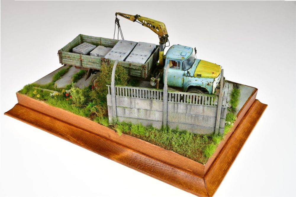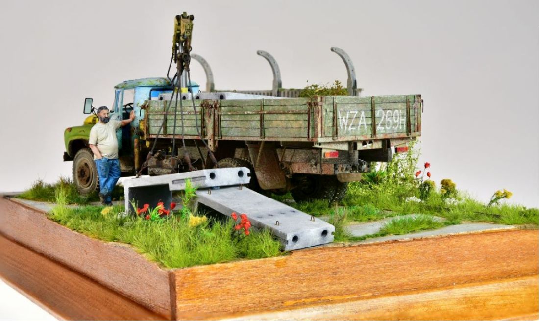 Płyty drogowe zrobiłem z masy tynkowej wciśniętej w formę silikonową. Stąd taka fajna fakturka. Można tutaj uzyskać naprawdę dużo różnych wariacji powierzchni. Pomysł myślę b. dobry na imitację starych płyt betonowych.
