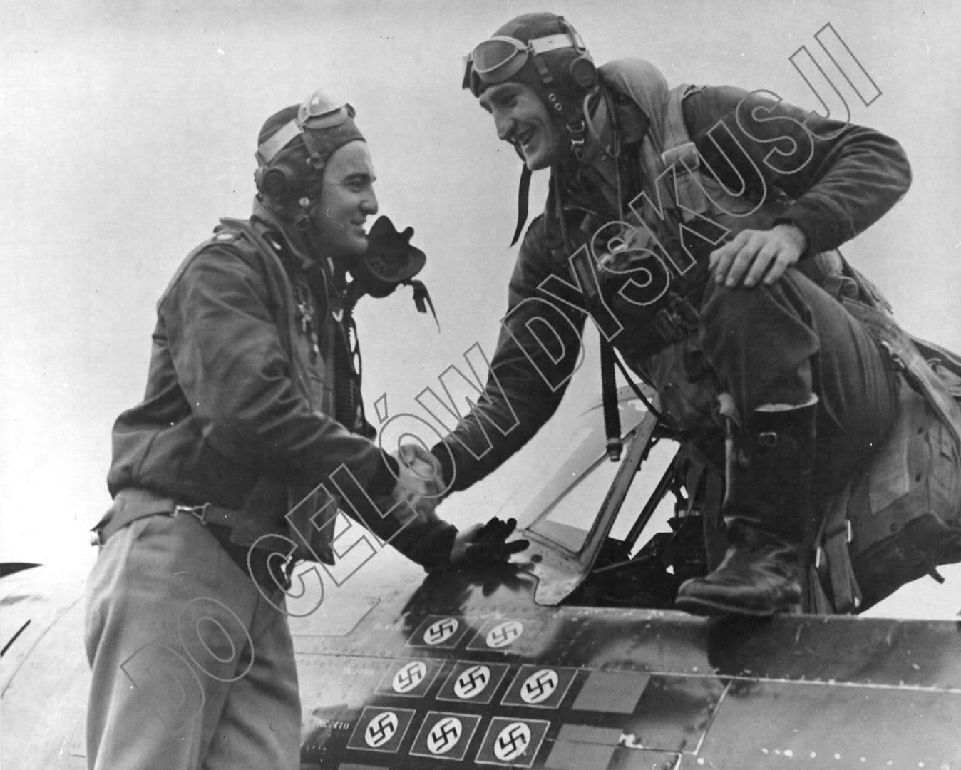 Annotations: LTC Francis Gabreski of the 61st Ftr Sq, 56th FG being carried from what is probably his last "razorback" P-47D, serial 42-25864 (coded HV-A).
