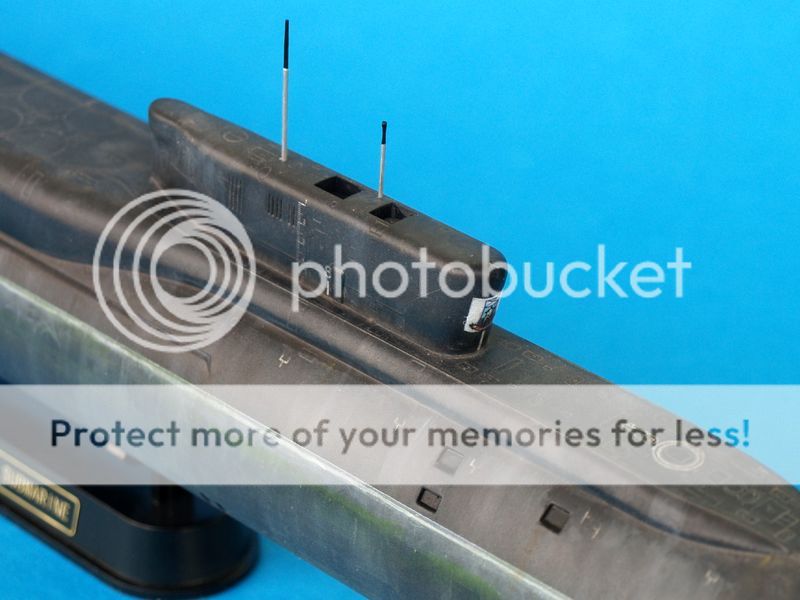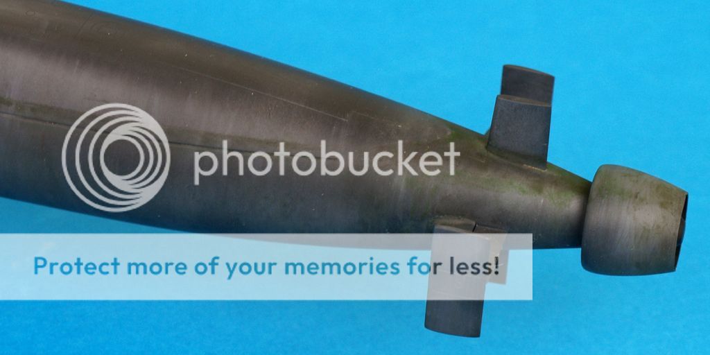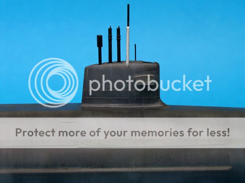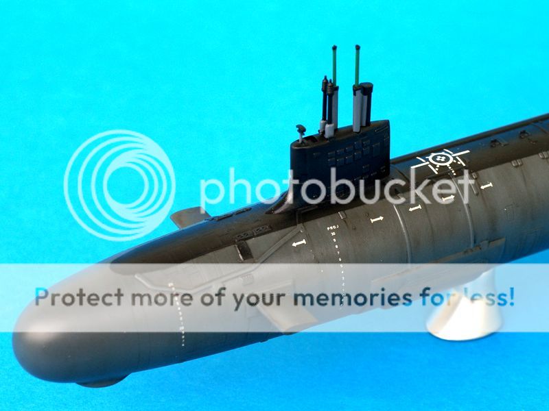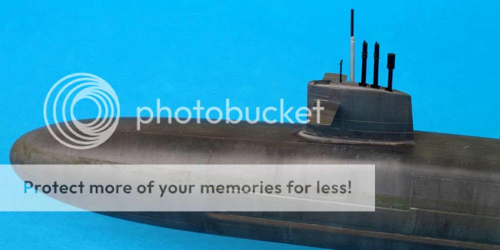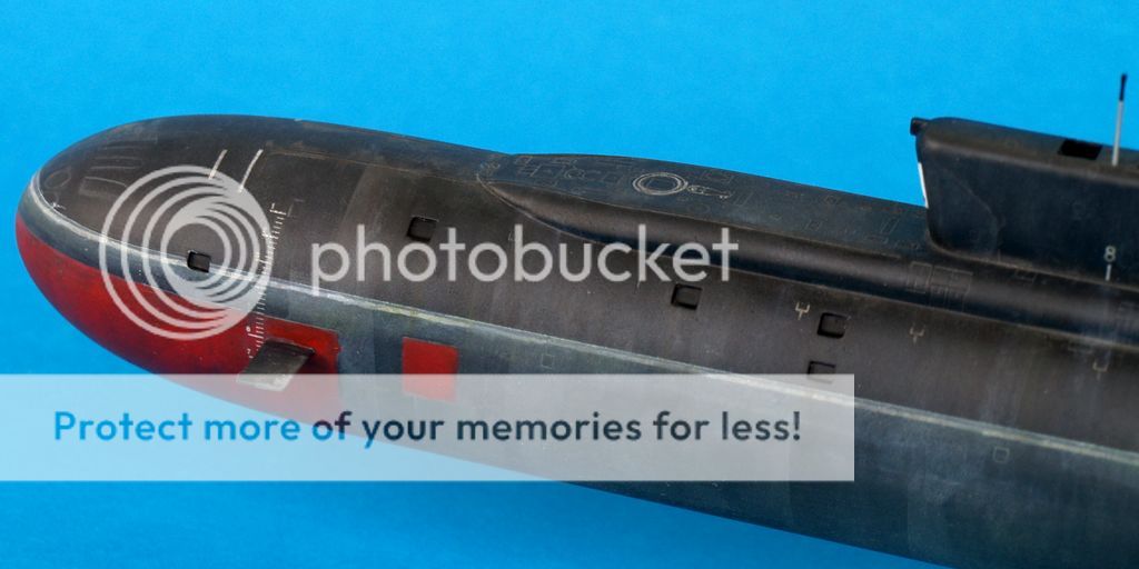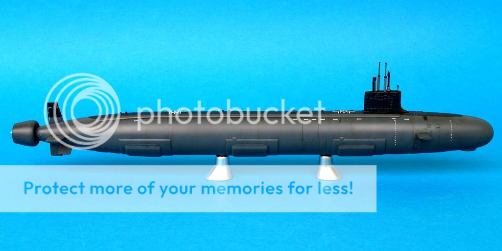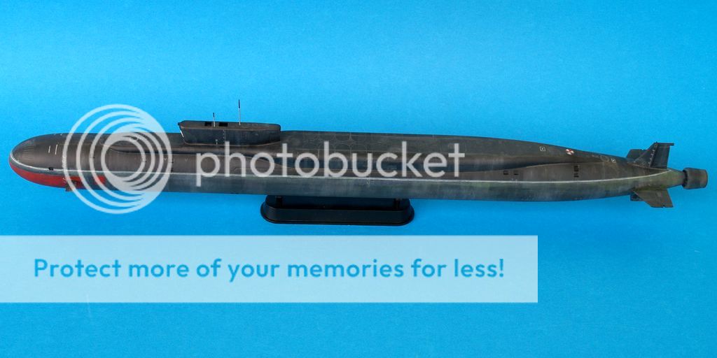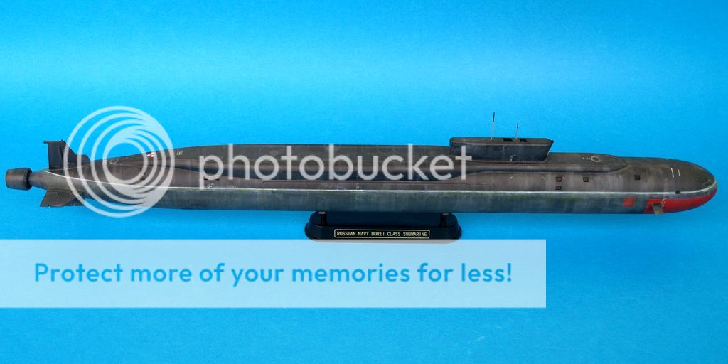 Ostatni, z którego jestem najmniej zadowolony to kolejny boomer, najnowszy tego typu we flocie rosyjskiej Yuri Dolgoruky. Jak to ujął jeden z formowych kolegów powinien wyglądać jak z salonu okrętów podwodnych. W moim wydaniu wygląda jak po kilku latach służby we flocie rosyjskiej. Sam model chyba był robiony przez HobbyBoss szybko gdyż odnoszę wrażenie, iż w prezentowanej czwórce wypraski odstają trochę jakością wykonania. Niedługo jednak ma się ukazać kolejny model tego okrętu, tym razem z Bronco.
