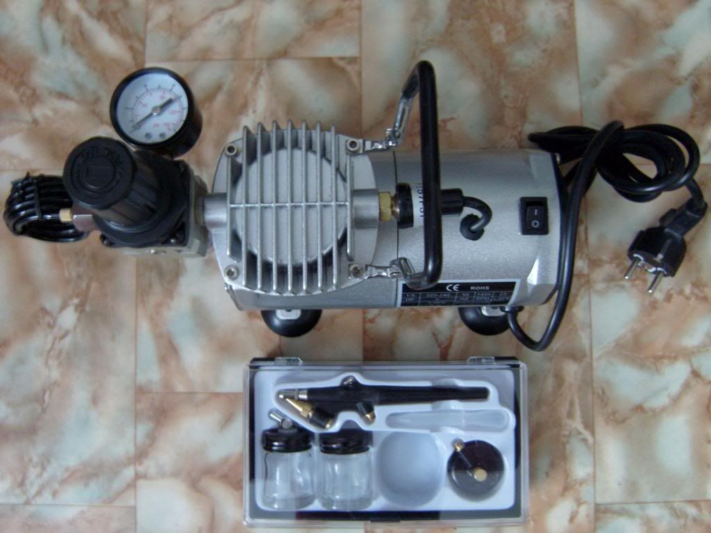 Kwestia kompresora. Ten mały kompreor ze zbiornikiem wyrównawczym w zupełnosci wystarczy . Ma regulacje ciśnienia i ona tez jest wystarczająca. Przez okreslenie " nabicie" kompresora nalezy rozumiec włączenie go na 1- 2 minuty by ciśnienie w zbiorniku wyrównawczym doskoczyło do oczekiwanego przez nas poziomu i dopiero wtedy rozpoczęcie malowania. 20 - 30 minut pracy i przerwa na wyłaczenie aerografu tez w zupełnosci wystarczy.